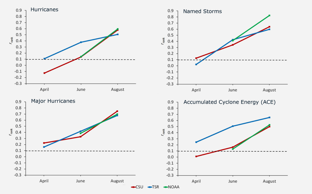 Rank correlations for three different forecasting agencies related to four different parameters: accumulated cyclone energy, major hurricanes, hurricanes and named storms. Note that the skill of the models applied by each of the agencies improves as the peak of the Atlantic hurricane season approaches. The Tropical Storm Risk group shows the best real-time from 2003-2015 for accumulated cyclone energy.