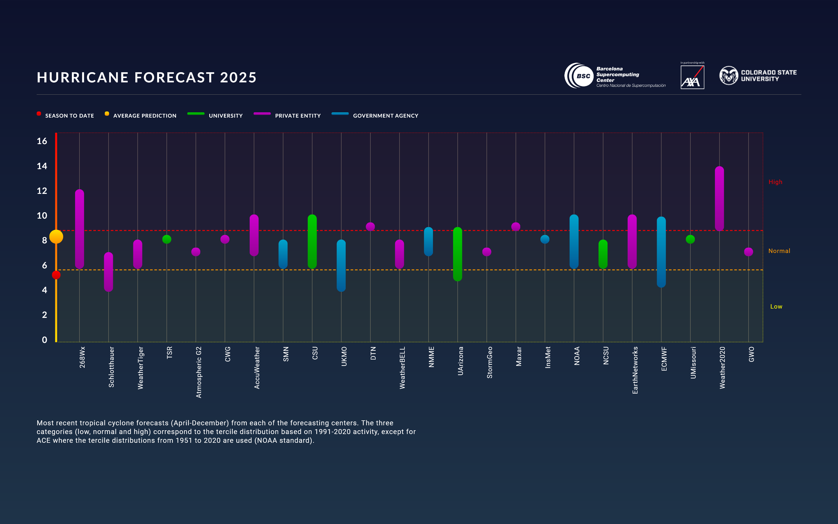 The consensus of the seasonal hurricane forecasts released in 2025 was that the season would be near to slightly above normal, given relatively warm sea surface temperatures across the tropical Atlantic and anticipated cool neutral ENSO or weak La Niña conditions. Cool neutral ENSO and La Niña conditions typically produce lower levels of Atlantic vertical wind shear, while a relatively warm Atlantic provides more fuel for developing tropical storms and hurricanes. Most groups submitting seasonal hurricane forecasts to the Seasonal Hurricane Predictions platform in 2025 called for near to slightly above-normal activity. These forecasts generally did not change much over the course of the season. The average of all seasonal outlooks issued at these three lead times was near the observed value for ACE in March/April (150 ACE predicted), in May/June (143 ACE predicted) and in July/August (142 ACE predicted).  While the season was above normal, similar to what happened in 2024, there was a pronounced mid-season lull between late August and mid-September when the Atlantic had no named storm activity.